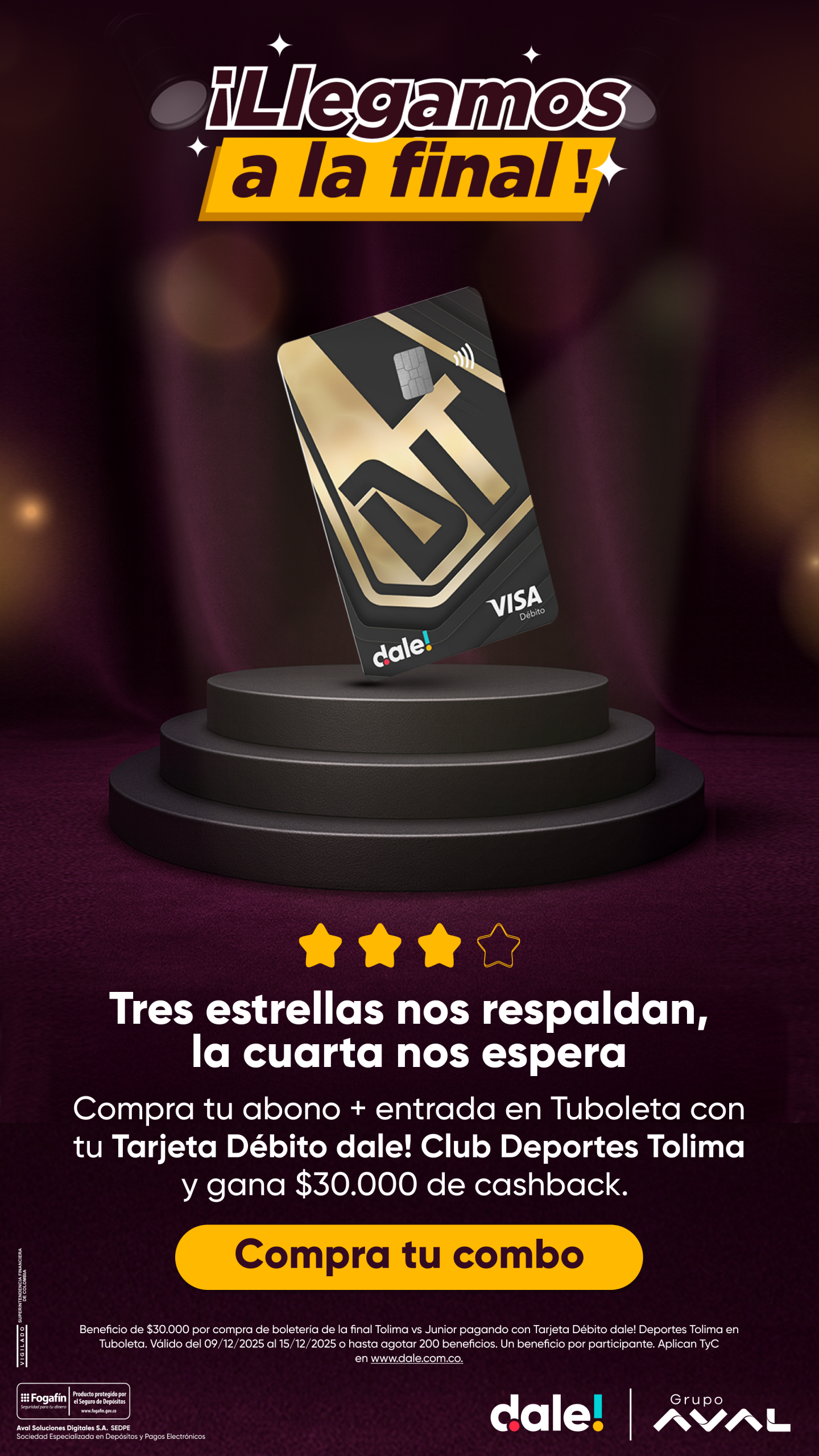 El beneficio está inspirado en la historia del Deportes Tolima: tres estrellas los respaldan y la cuarta los espera. Quienes adquieran su abono + entrada con la Tarjeta Débito dale! – Club Deportes Tolima recibirán $30.000 de cashback. Además, al realizar su compra con dale!, los usuarios disfrutarán de los beneficios habituales de sus tarjetas.