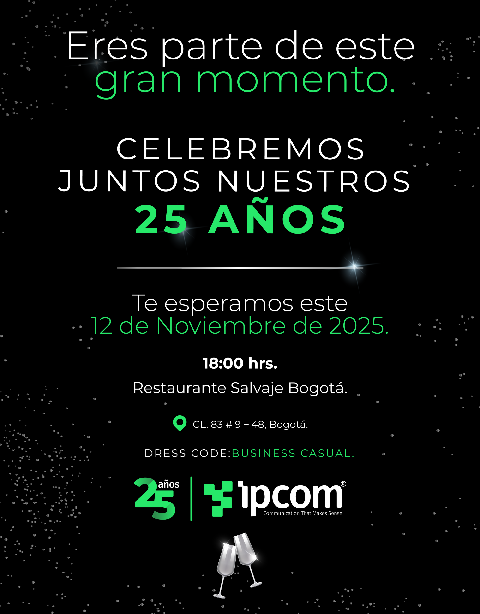 Ipcom cumple 25 años de trayectoria impulsando la innovación y la tecnología en el sector de las comunicaciones. Para conmemorar este importante logro, la compañía celebrará una velada especial el próximo 12 de noviembre de 2025 en el Restaurante Salvaje Bogotá, donde reunirá a colaboradores, aliados y amigos que han hecho parte de este camino.